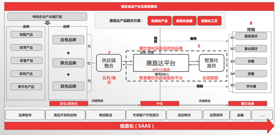 基于惠直达现有资源禀赋,并结合市场发展趋势,重新梳理了智慧餐饮供应链新物种的s2b2b产业互联商业模式。
