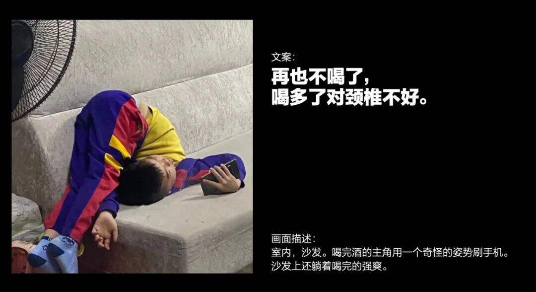 提案结束,我们在会议室里和客户接着脑暴。虽然我们已经提了不少idea,但当客户说出「再也不喝了」这句话时,大家还是惊觉眼前一亮,因为这是几乎每个人喝多了都说过的一句话。尤其是,跨年夜喝多了之后。尤其尤其是,跨年夜喝多还干了蠢事之后……于是,诸多关于酒后迷惑行为的画面在我们脑子里蹦了出来。