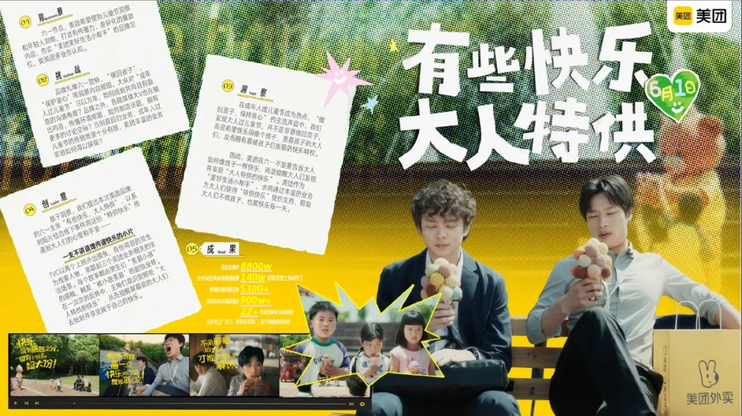 和美团合作儿童节的项目时,我们遇到的挑战是,美团的业务客群不是小孩。依照我们惯常的思路,很容易把它做成亲子项目,比如说,儿童节忘记给孩子买礼物,赶紧上美团买玩具。但我们想把这个项目从玩具品类中解放出来,让美团和目标客群真正沟通。