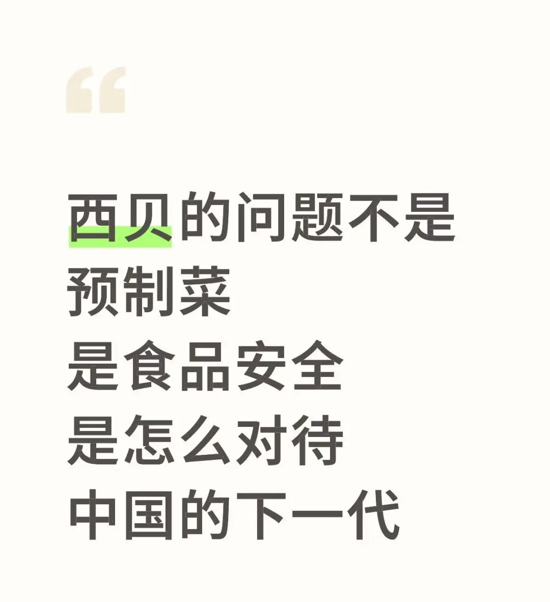 企业从宣传上一直号称“把更好的给孩子”,通过各种话术与线下活动,让无数父母信任了西贝。然而内在暴露的问题,说明西贝完全是欺骗消费者,是无视中国下一代的健康。
