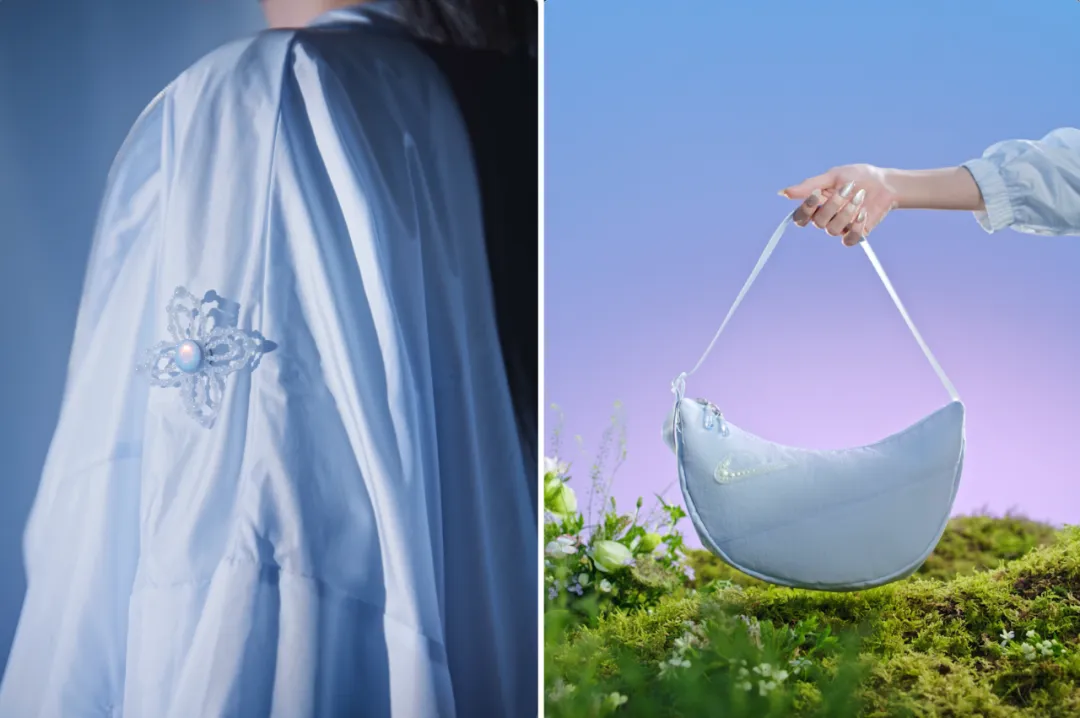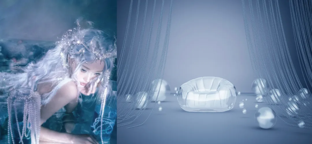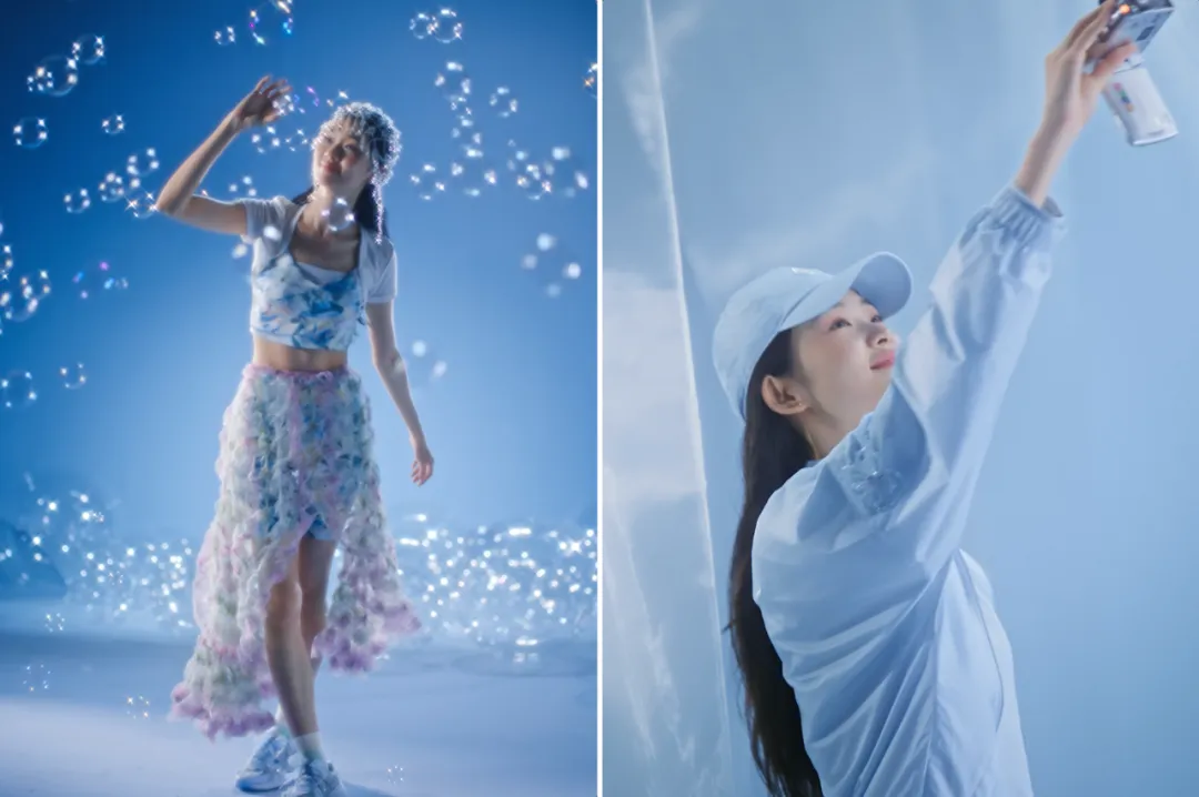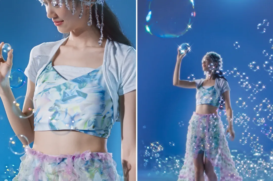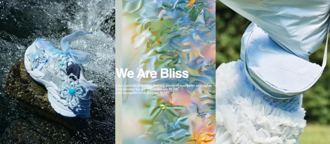 无论是滚落脚边的玻璃珠,折射身影和畸变迷离的透明气球,包裹梦境的梦幻泡泡或托举在手的水晶球,摇曳的珠帘或顺滑的透明沙发……这些不同形态和质感的大小“水珠”,都让鞋款的透珠细节和“We are Bliss”的印花穿搭进入了更为具体而丰富的产品故事和场景。