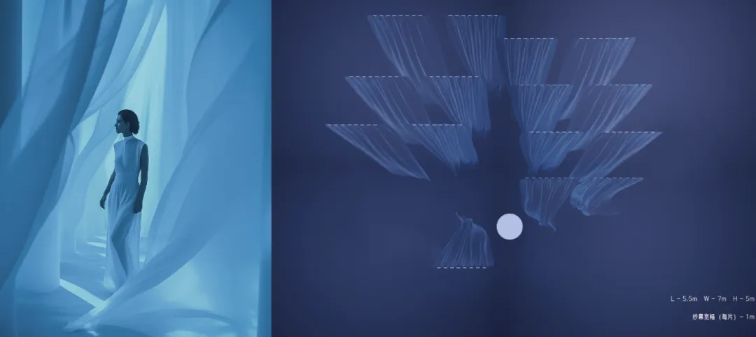 在具体执行中,通过纱幕组成的光影迷宫,让女生若隐若现穿梭其间。结合人物动作的特写,和意识流的光影画面,切换梦境和现实,创造奇幻静谧的氛围。