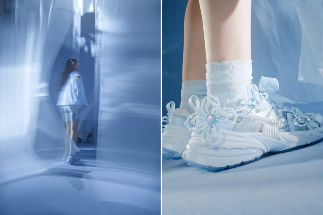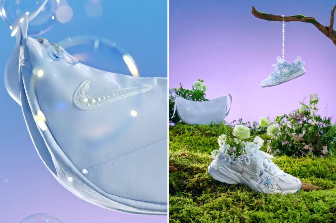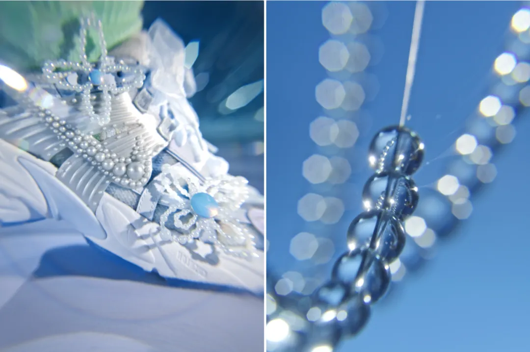 系列的初始灵感,源自设计师的一次潜水经历——希望展现阳光传统水面,与人们呼出的气泡交汇时转瞬即逝而柔美有力的瞬间。设计师标志性的手工串珠形成了沿Swoosh流淌的形态,和空气般灵动的立体花型。