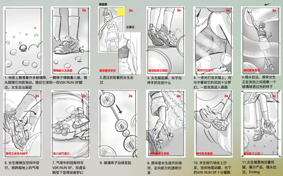 当人物穿行其间,珠帘的垂坠和光影折射,通过镜头语言营造朦胧的珠华流转。同时泡泡的轻盈梦幻,也让人物的动作更显灵动愉悦,展现鞋服细节同时增加更多画面趣味。