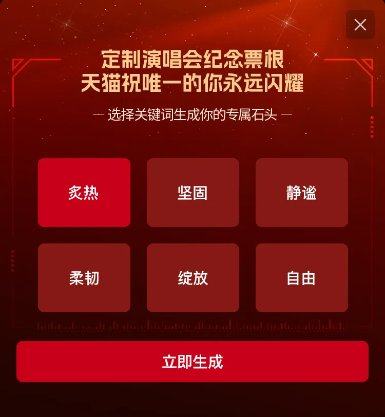 互动的开始,粉丝在淘宝搜索“易烊千玺”进入活动页,完成任务可选择一个祝福关键词生成专属石头电子票根。