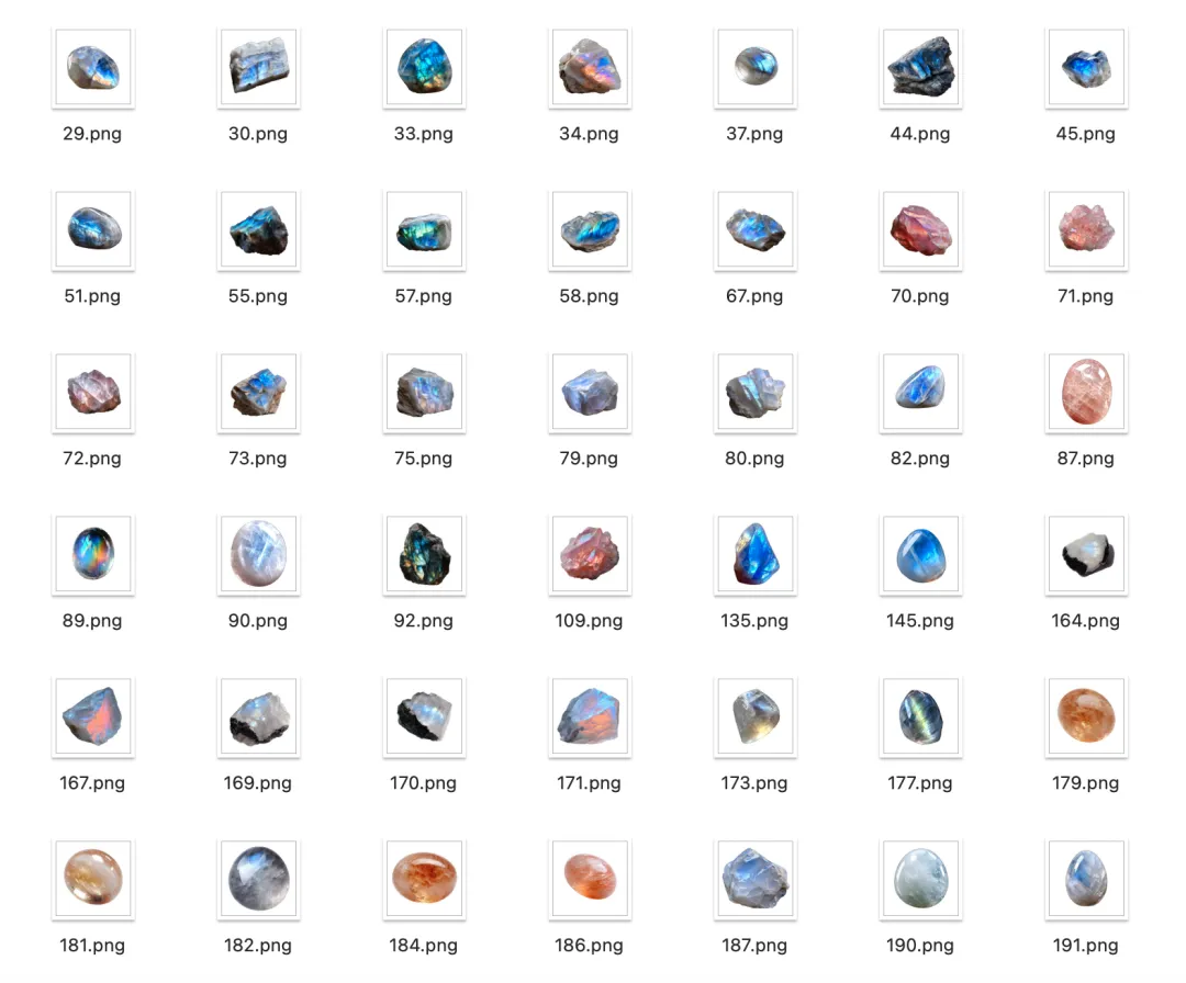 我们首先筛选出每个城市周边矿石中,与六个关键词气质相符的种类,最终3个城市共收集了22种矿石的详细特征,整理成表交付AI团队。为了实现真实的原生感、保证每个石头之间的差异性,AI团队不断调试,仅一种矿石就要生近300张,有的甚至生到700多张,确保粉丝收到的每一个石头都漂亮且独特。