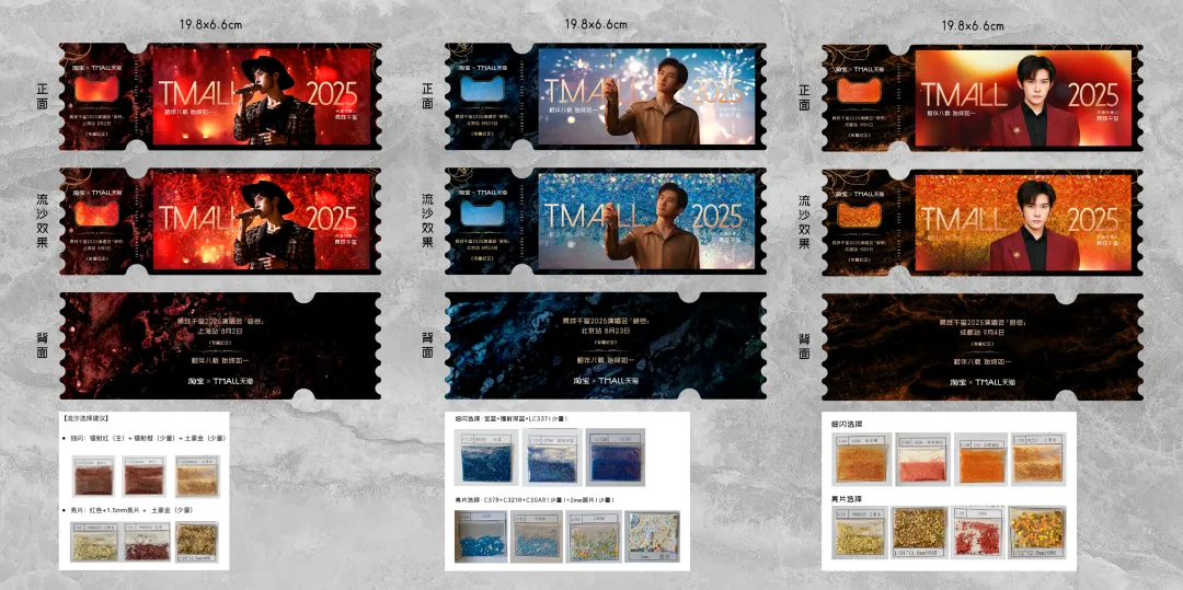 我们为三城演唱会分别设计了票根,每场演出的票根上都印有该城市的市花与演出日期,打造专属印记。粗细颜色不一的细沙和亮片交织汇聚,轻轻翻转,流沙流动闪耀如同微型的演唱会在眼前徐徐开启。