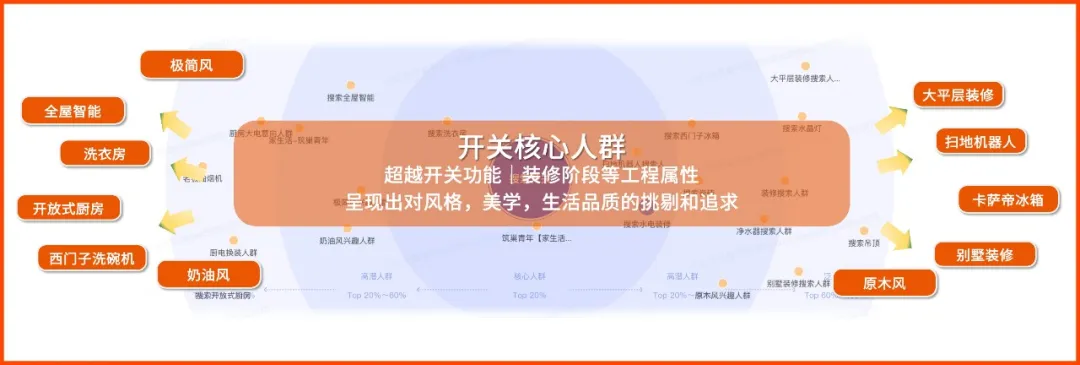 通过对小红书上开关品类人群的下钻分析(下钻关联品类/装修风格/装修阶段/生活方式等),我们发现,开关核心人群是一群有态度的美学生活家。他们超越开关功能/装修阶段等工程属性,呈现出对风格、美学、生活品质的挑剔和追求;对他们而言,开关不是冰冷的电工产品,而是家居风格的 “一块拼图”。