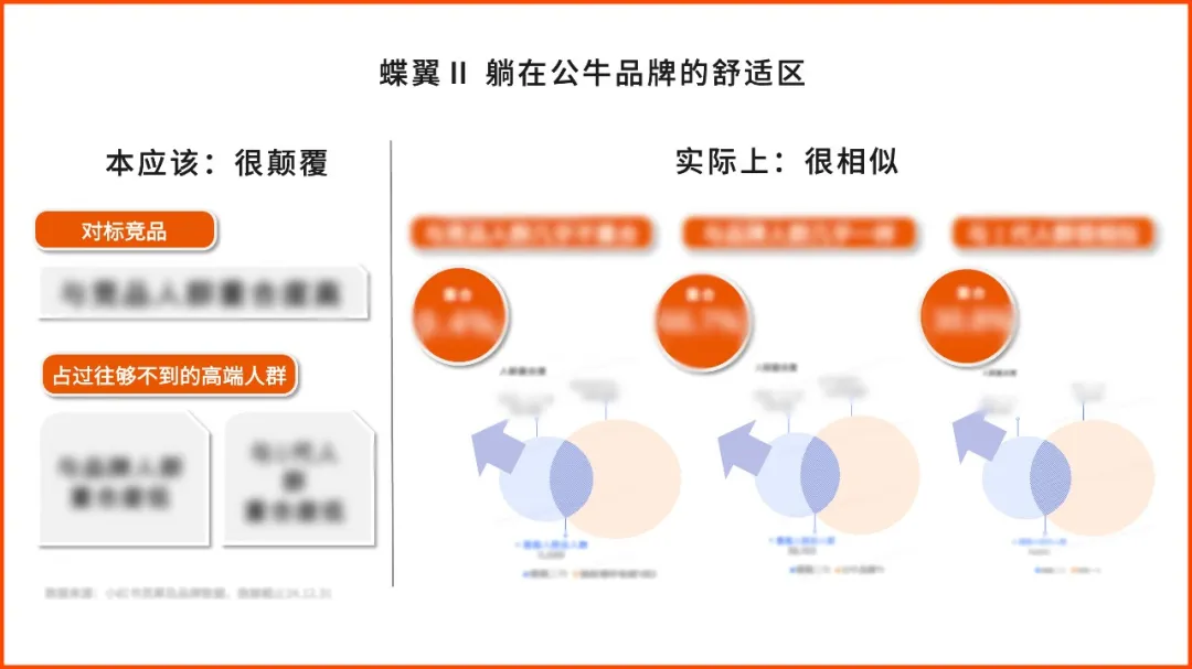 但到了“蝶翼Ⅱ”这一更为高端的产品,理想中的用户情况应该是“对标高端竞品,与竞品人群高度重合”以及“占据过往够不到的人群,与品牌既有人群重合度低”,然而实际情况却完全相反。