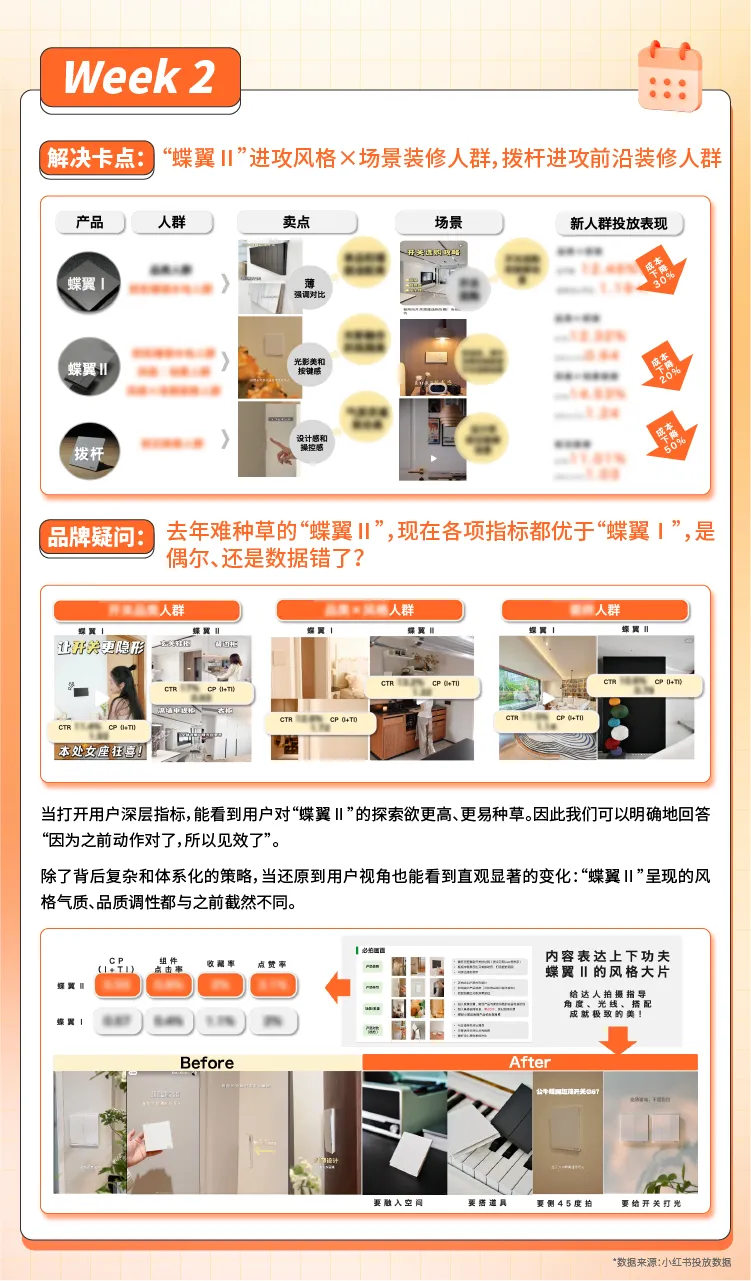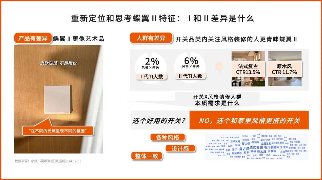 • 高端品仍有成长空间,需要发力:2024年尽管公牛开关在小红书实现了整体品牌和生意的增长,但投入行业领先预算主推的高端品“蝶翼Ⅱ”没有像“蝶翼Ⅰ”呈现爆发式的增长。