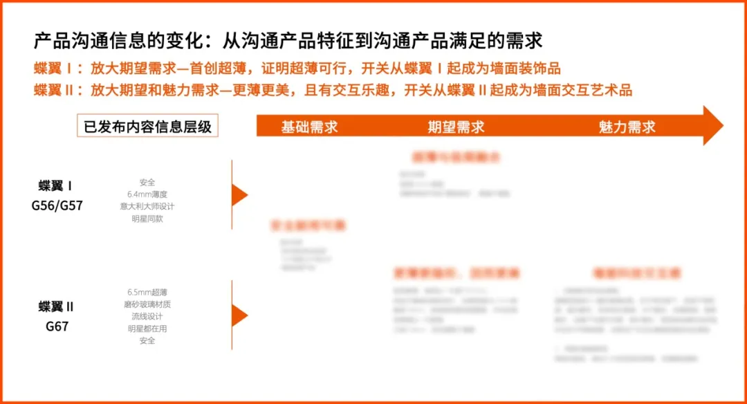 于是策略上,栗栗橙将“蝶翼Ⅱ”定位为品牌的高端心智引流品,锚定对开关具有美学需求的人群,并针对其卖点进行了重新梳理和升级,从沟通产品特征(卖点,例如6.5mm超薄、磨砂玻璃材质、流线设计等)转变为沟通产品满足的需求(用户价值利益点):更薄更美,有交互乐趣,更像是墙面交互艺术品。