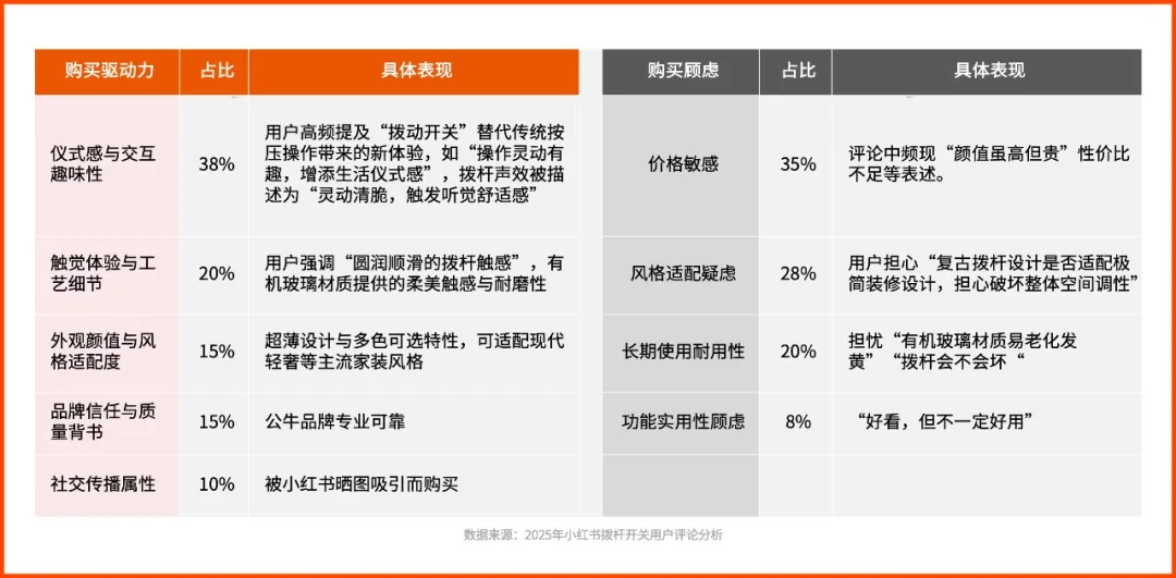 随后我们开始思考另一个问题:既然拨杆开关充满仪式和掌控感,为什么依然是需求极少的小众赛道?通过对小红书200 篇拨杆开关内容下的 1000 条评论进行分析,我们发现用户虽然感兴趣,但关于“价格贵,难搭配,不耐用,不好用”等实际购买的顾虑也很多。