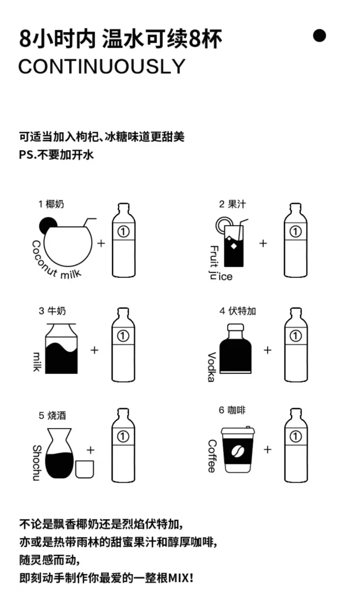 这一创新饮法,一方面让原材料得到充分利用,剩余价值最大化,花1瓶水的钱可以喝1天,一整天都元气满满。一整根19.9元/瓶的价格,此前曾让不少消费者感觉有点小贵,有了这一方案后,按一天8杯水计算,那么每杯水的价格仅为2.5元,这就提高了产品的性价比,让人感到实惠、实用、物超所值,从而提升消费者的购买意愿。
