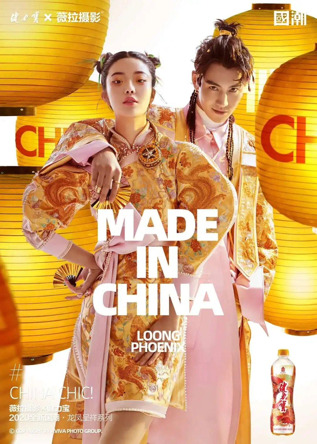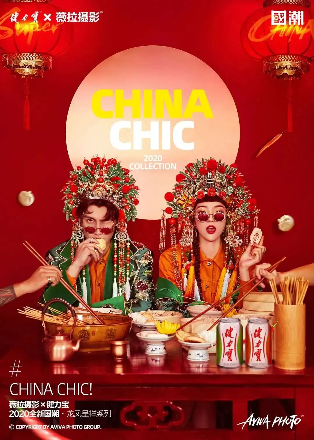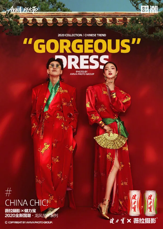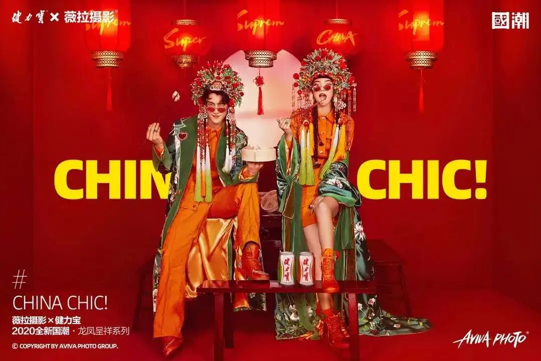 联合高端婚纱照品牌薇拉摄影,拍摄了一组国潮大片,将凤冠霞帔、传统婚服与当代时尚相结合,古色古香的国风装饰与街头小吃、健力宝相融合。