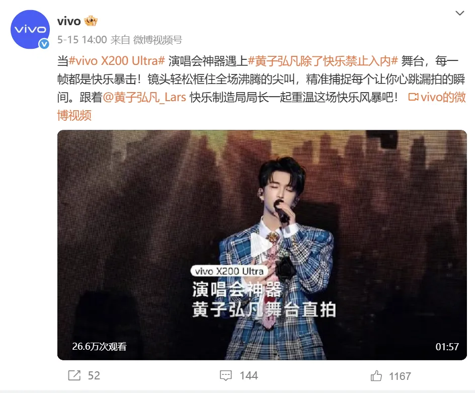 另一方面,vivo还与众多明星艺人演唱会进行合作,如王心凌、王力宏、黄子弘凡等,打造官方合作演唱会神器。它在演唱会现场大屏投放产品广告,并请明星在现场使用手机记录精彩瞬间,在社媒平台上形成了引爆。