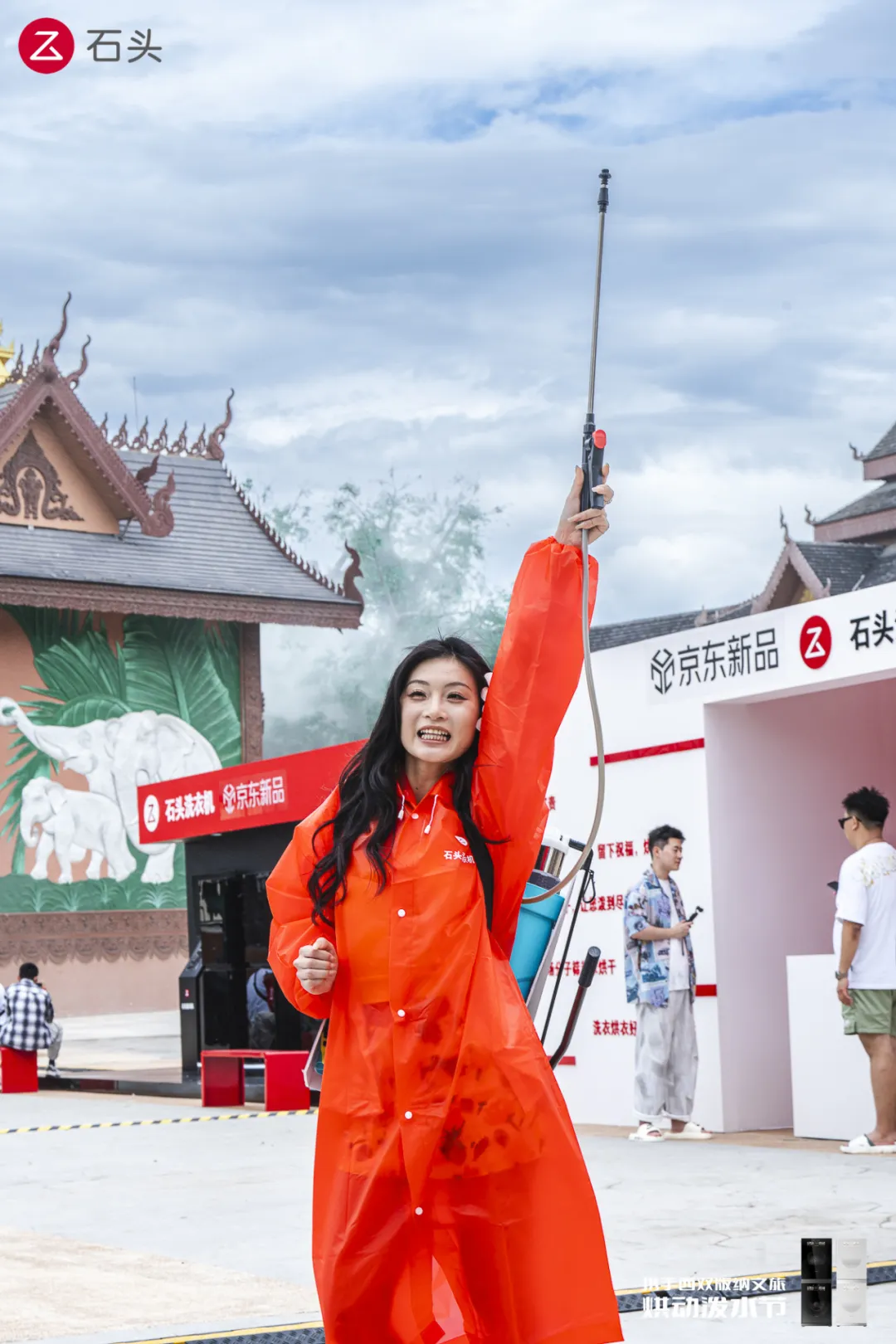 在活动现场,石头科技还打造了三米高的洗衣机巨物装置,提供免费的水枪、水盆、定制T恤、雨衣冰袖等泼水用品,增强品牌的存在感。