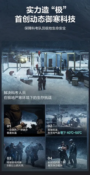 极地高寒环境就是一个羽绒服的极限使用场景。像南极洲,它既是地球上最为寒冷的大陆,平均气温在零下50度左右,还是世界上最干燥的、风力最强的地区之一。这样的使用场景,对于羽绒服的产品性能提出极高的要求。