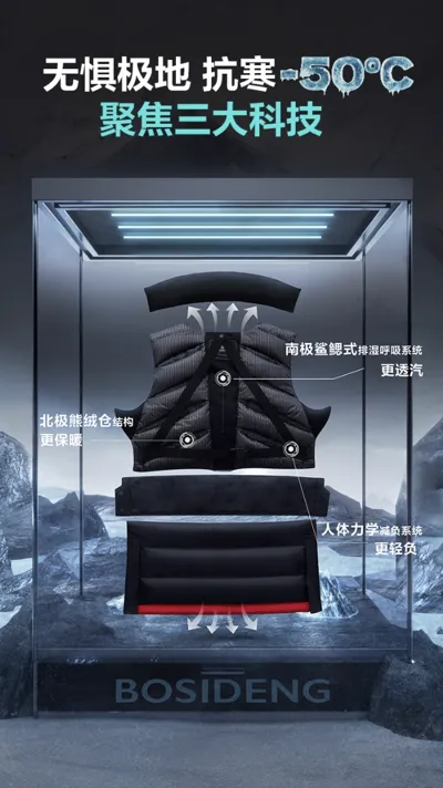 2024年中国极地考察迎来40周年,波司登还与中国极地研究中心合作共建极地考察极端环境综合实验室,共同研发极地功能性羽绒服产品。当年10月,波司登又在极地中国举办新品发布会,推出了专为极地探险设计的极地极寒系列羽绒服,并将其交付给即将启程前往南极的中国第41次南极科学考察队员[14]。