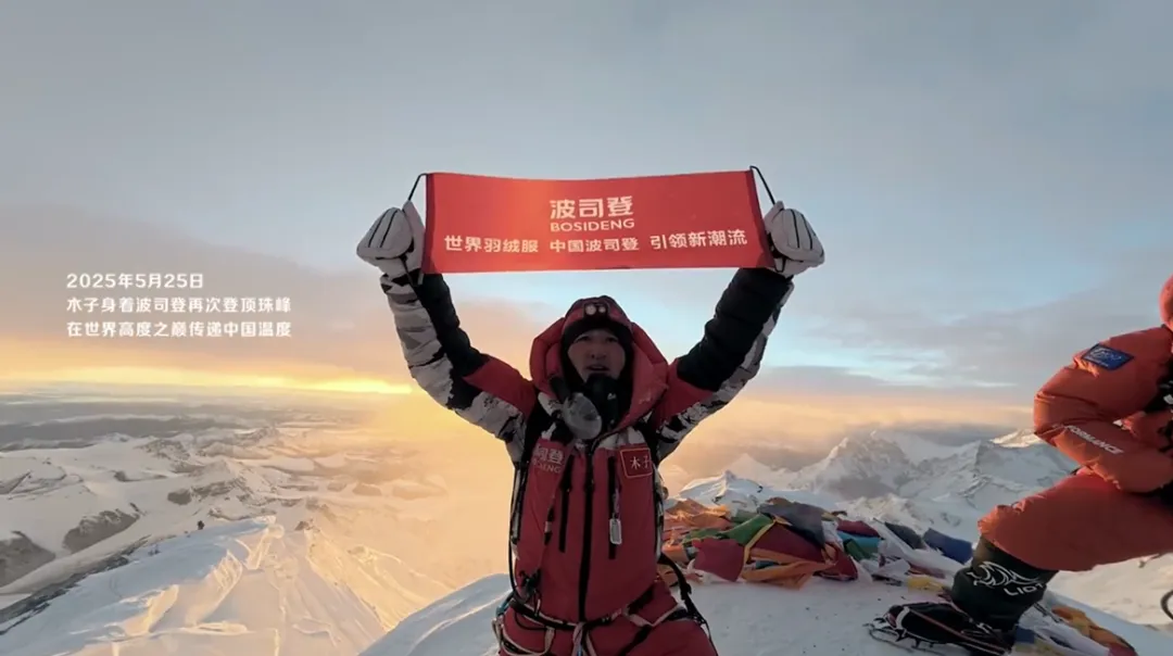 再如“登顶珠峰”这样的极限场景。中国登山运动员木子(李生涛),2023年攀登珠峰至海拔8450米处,因救援他人放弃个人冲顶机会,两年后他重返珠峰,于2025年5月25日身披波司登登峰系列装备,在-50℃极寒中成功登顶。