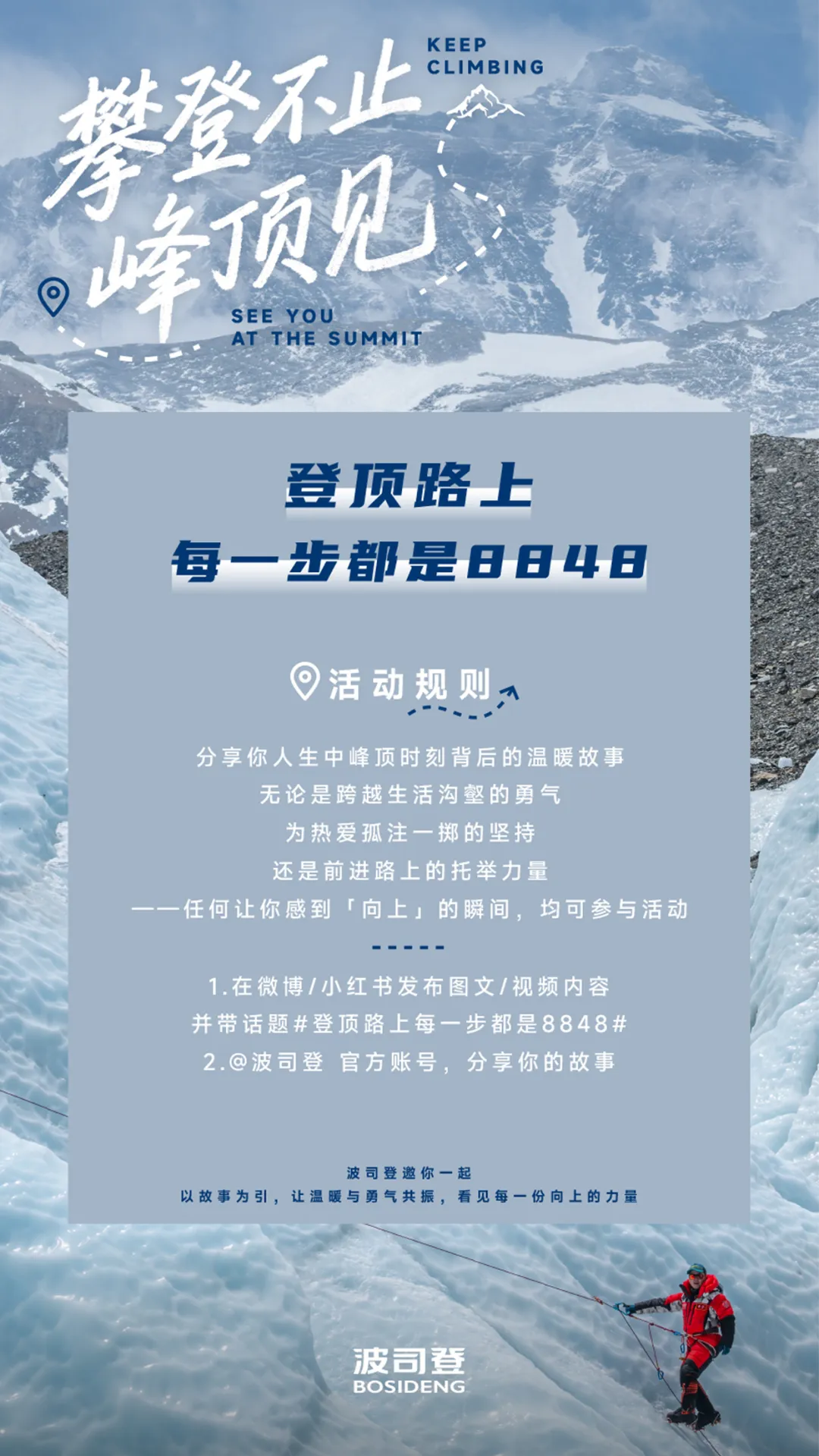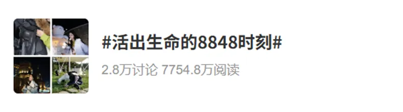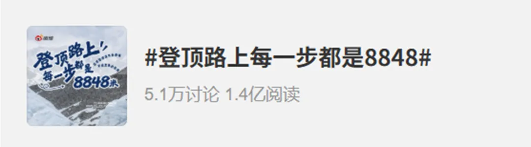 而且在传播中,波司登还在微博上发起了#登顶路上每一步都是8848 和 #活出生命的8848时刻 等全民话题,面向消费者征集个人攀登人生旅途的故事。这一做法将“8848”转化成普通人日常向上、勇于突破的精神与力量,引发数万名用户分享个人故事,两个话题在微博上分别获得1.4亿阅读和5.1万讨论、7754万阅读和2.8万讨论。
