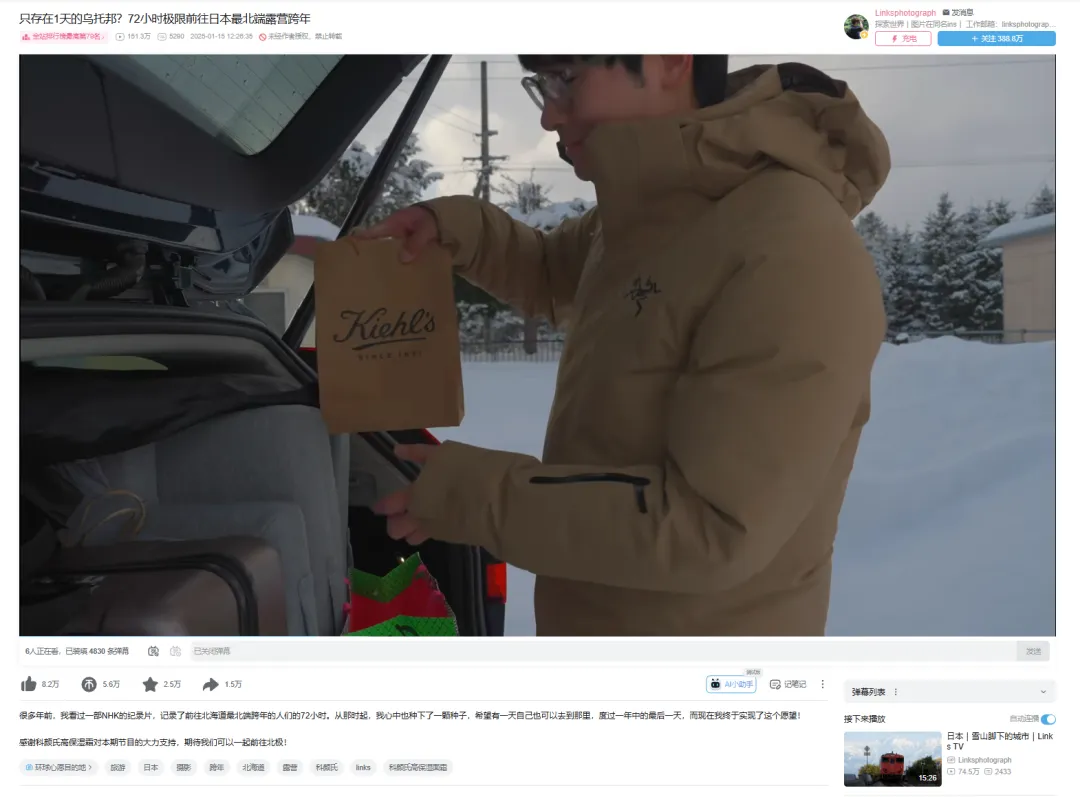 拿护肤品牌科颜氏来说,其经典产品线高保湿霜从去年9月开始,就以户外场景为核心,和不少B站户外UP主合作,比如和UP主Linksphotograph共创的视频里,品牌产品跟随UP主的脚步从东京出发,经过72小时跋涉来到北海道最北的小镇。