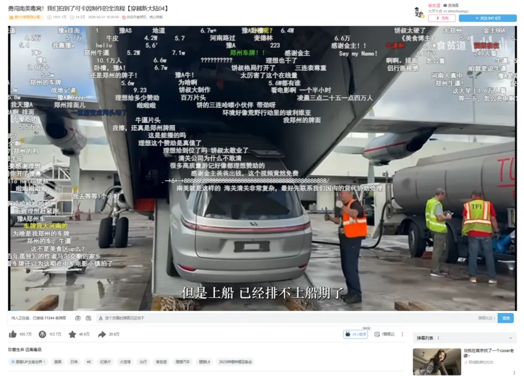它与UP主“食贫道”合作推出《穿越新大陆》系列内容,UP主带领观众们展开了一场新奇又丰富的旅行体验,在旅行场景中也自然了解到了理想汽车的性能。这个系列视频全网播放量超过3000万,很多观众还在弹幕中表达了对品牌方的喜爱与感谢,收获了满屏的“感谢金主”。