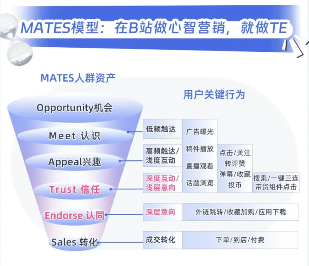 B站的人群资产模型叫做“MATES”,它将消费者的购买旅程分成认识(Meet)、兴趣(Appeal)、信任(Trust)、认同(Endorse)、转化(Sales)五个环节。与其他平台的人群模型不同的是,B站将品牌与消费者的深度交互拆解成了信任、认同两个环节。