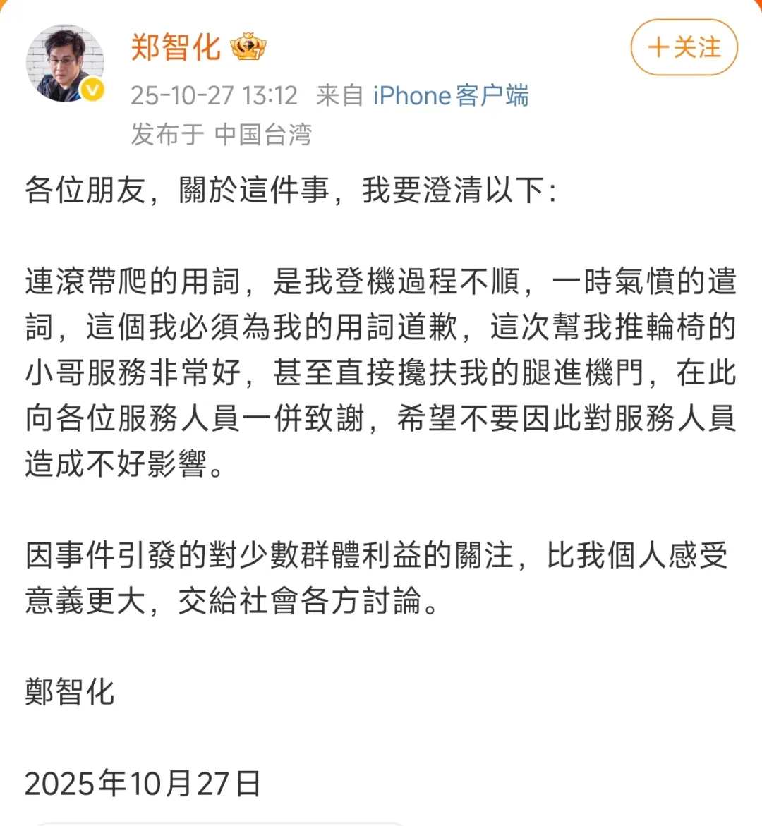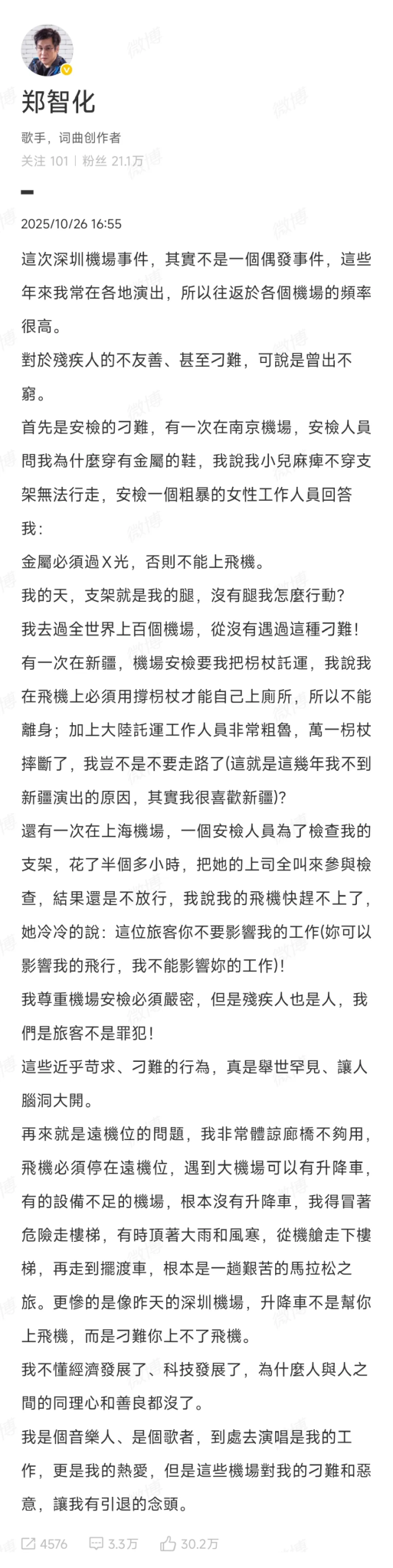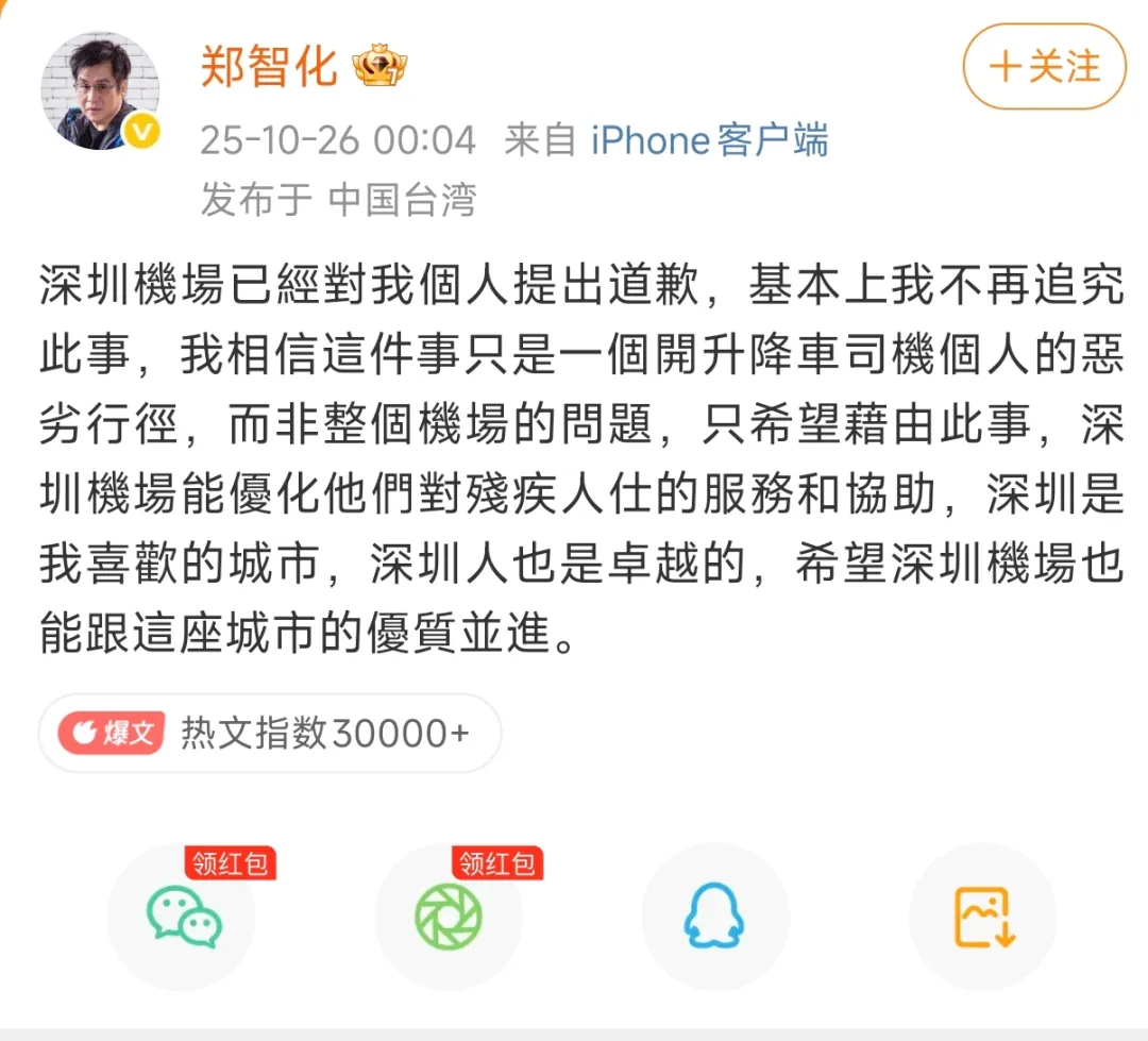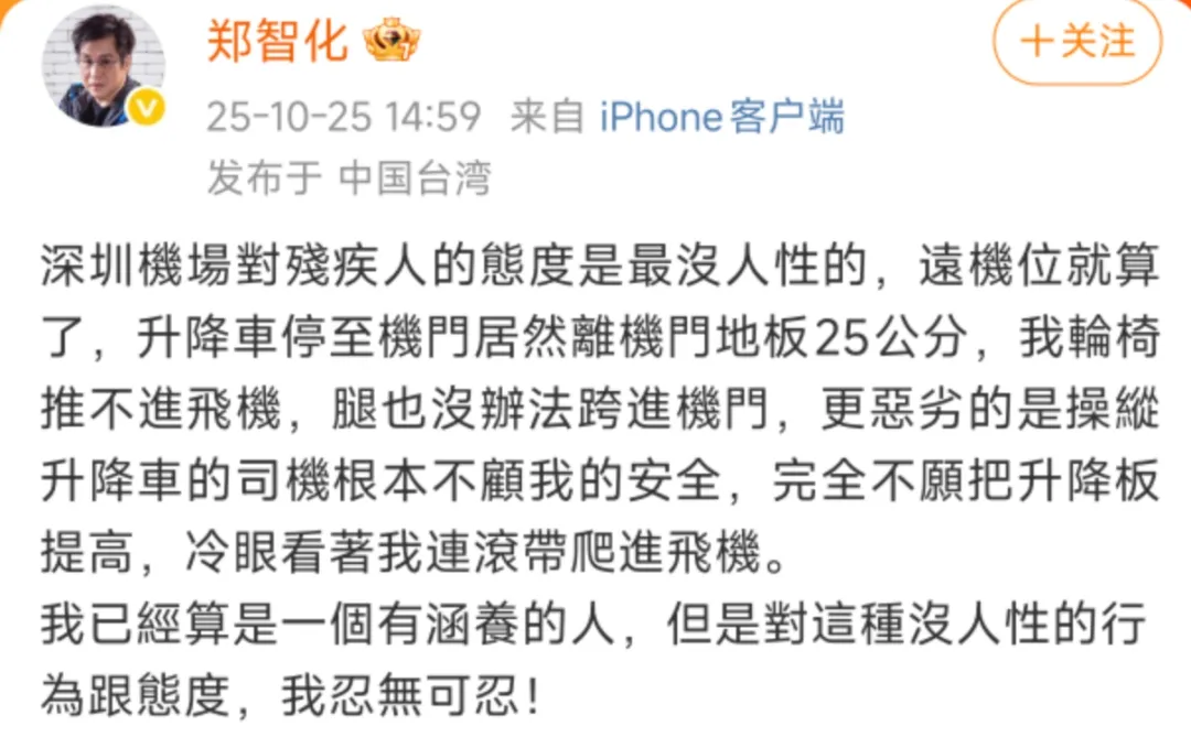 10月25日14:59,郑智化发的一条微博,直接怼到深圳机场脸上:“深圳机场对残疾人的态度是最没人性的”,“操作升降车的司机根本不顾我的安全,完全不愿把升降板提高,冷眼看着我连滚带爬进飞机”,“我已经算是一个有涵养的人,但是对于这种没人性的行为和态度,我忍无可忍”。
