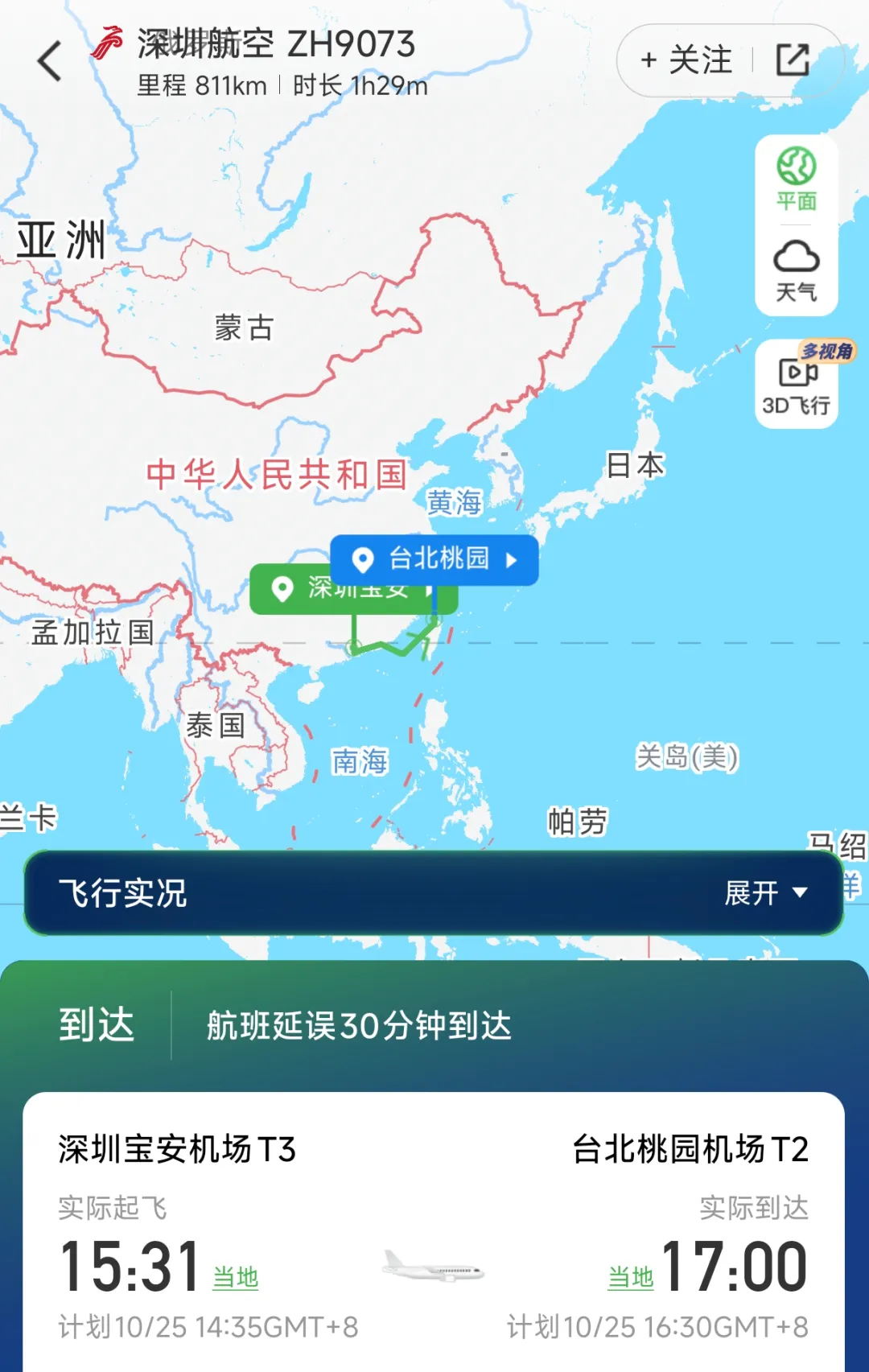 我们查了一下,郑智化乘坐的航班是15:31起飞,17:00到达。