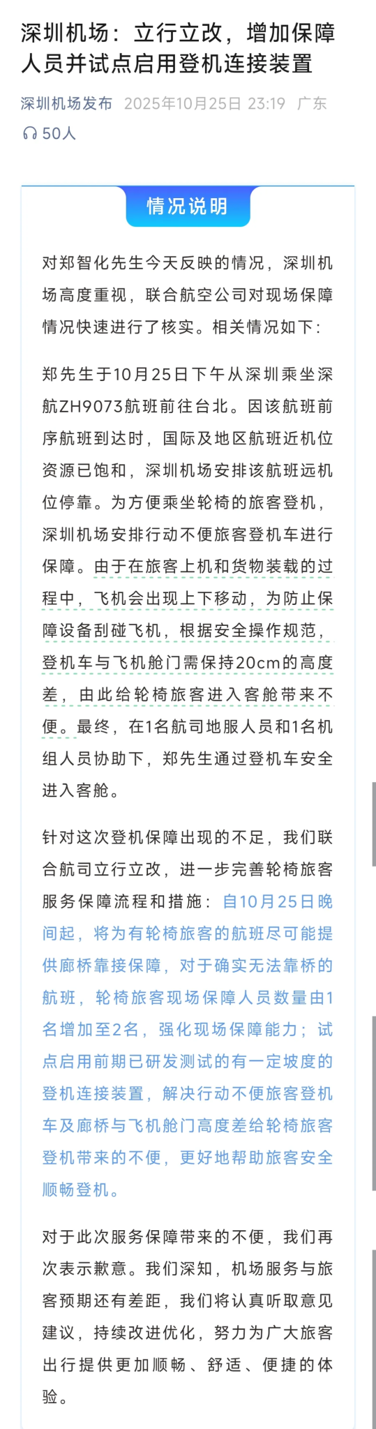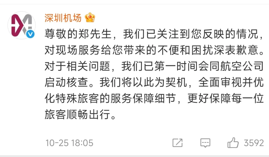 10月25日23:19,深圳机场连夜在官方公众号发布说明《深圳机场:立行立改,增加保障人员并试点启用登机连接装置》。建议仔细读下文本。