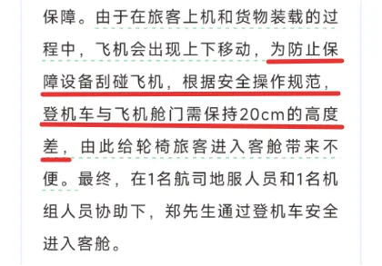 2)升降机的操作员,没有任何问题。留了20公分,就是标准操作。如果要求他抬高一些,让轮椅进入,他照做了,才是违规。我作为经常要坐飞机的普通乘客,我希望所有机场操作员,都严格按照安全标准执行。