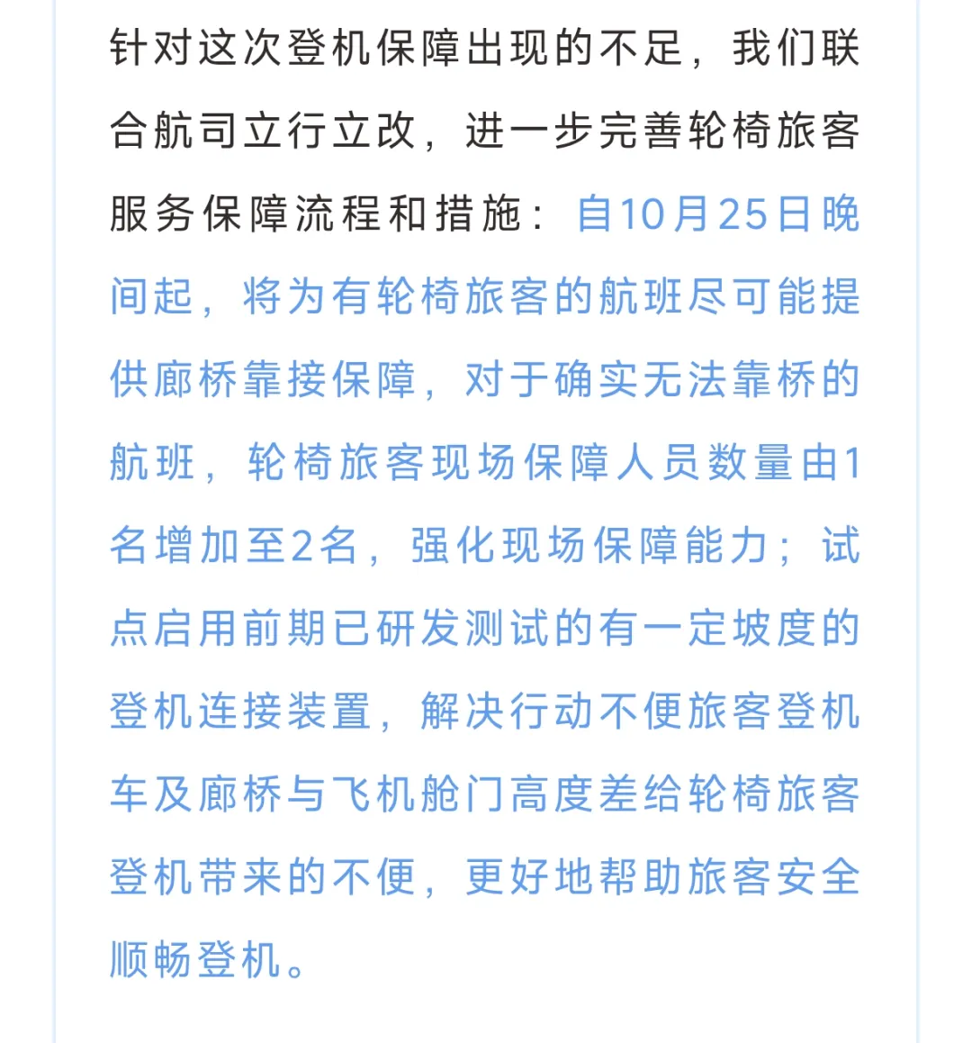 深圳机场还公布了一些整改措施,以后要尽量给有行为不便旅客的航班,安排廊桥;要增加服务人员;要启用有坡度的链接装置。
