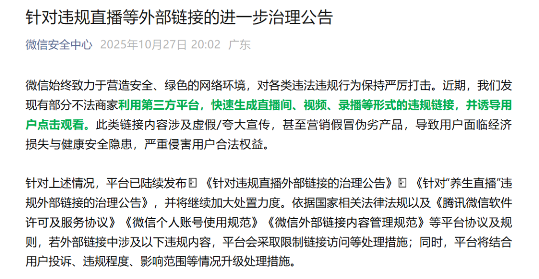 - 10月27日微信公告针对H5外链和云协作工具分享的直播链接,重点打击保健品、药品等虚假宣传。