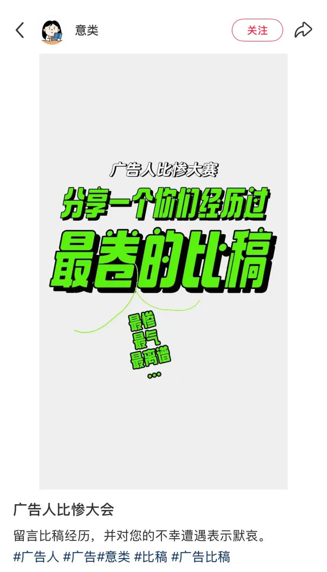 在小红书刷到了一个意类发起的,关于广告人比稿的惨痛经历的讨论,简直是闻者伤心见者落泪。