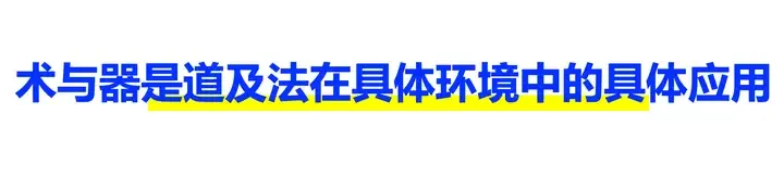 它需要回到这个规律本身,回到“道”本身。你掌握了基于道的整个规律后,完成了规律的顶层设计之后,实际上具体的问题是这个顶层设计和具体问题相结合下出现的问题,找到具体的方法,解决具体的问题,所以术与器是道及法在具体环境中的具体应用。