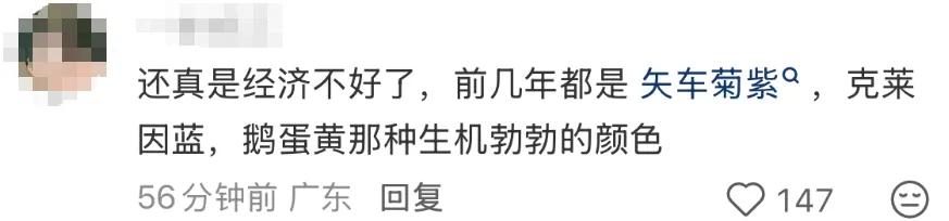 也有很多人表示很喜欢这个颜色,大家还喜欢把色彩和经济问题联系在一起,拮据的时候人们消费更理性,偏爱不过时、百搭的低调色系。云上舞白是带灰调的柔和中性色,无鲜艳色彩的张扬感。且经济状态不好时大众易求安全感,这种淡雅沉静的颜色能契合人们内敛的心态,和经济繁荣时流行的高饱和亮色形成反差。