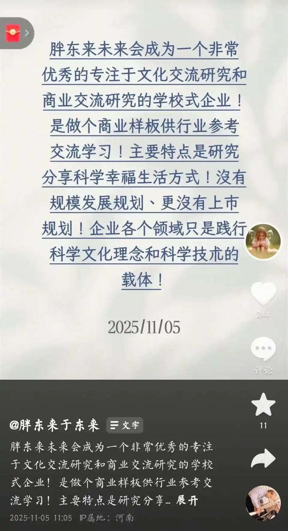 11月5日,胖东来创始人于东来在社交平台发布图文明确回应市场关切:胖东来没有规模发展规划,更没有上市规划。