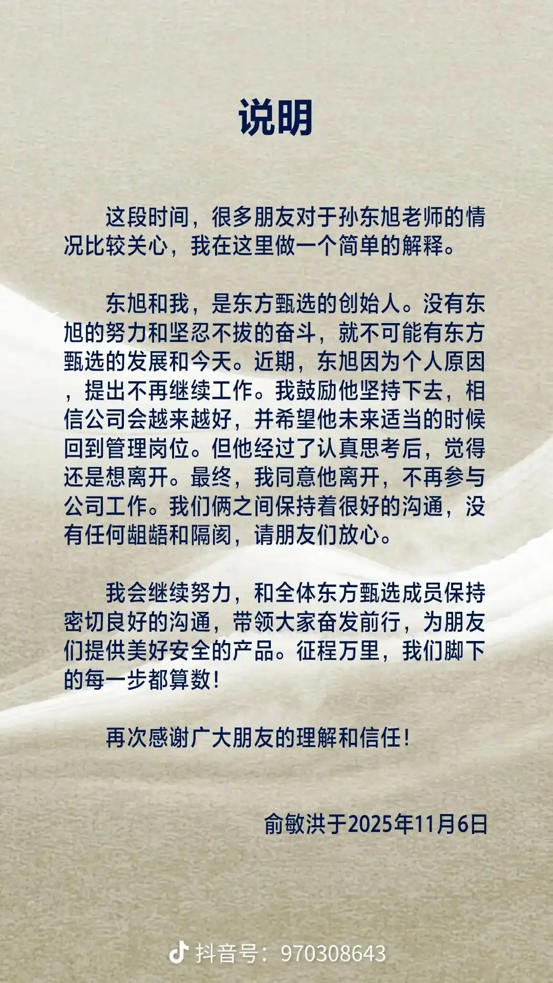 俞敏洪在说明中提到,“东旭和我,是东方甄选的创始人。没有东旭的努力和坚忍不拔的奋斗,就不可能有东方甄选的发展和今天。近期,东旭因为个人原因提出不再继续工作。我鼓励他坚持下去,相信公司会越来越好,并希望他未来适当的时候回到管理岗位。但他经过了认真思考后,觉得还是想离开。最终,我同意他离开,不再参与公司工作。我们俩之间保持着很好的沟通,没有任何龃龉和隔阂,请朋友们放心。”