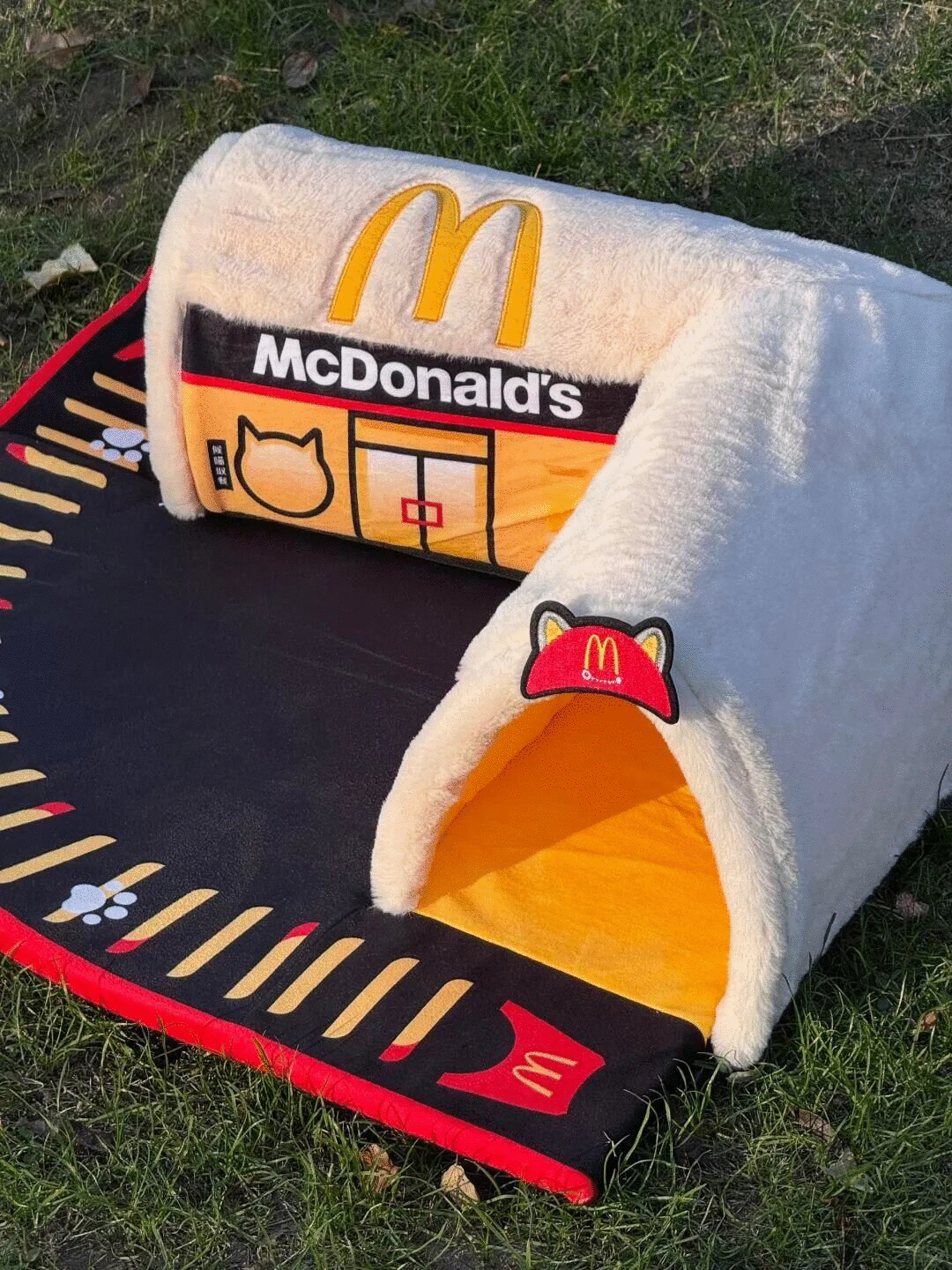麦当劳又一次上新猫窝啦。这回,猫窝的造型是个“喵当劳”,可以供小猫钻进钻出玩耍,可温暖过冬。喵星人还能倚靠在半包围的“停猫场”上休息片刻。