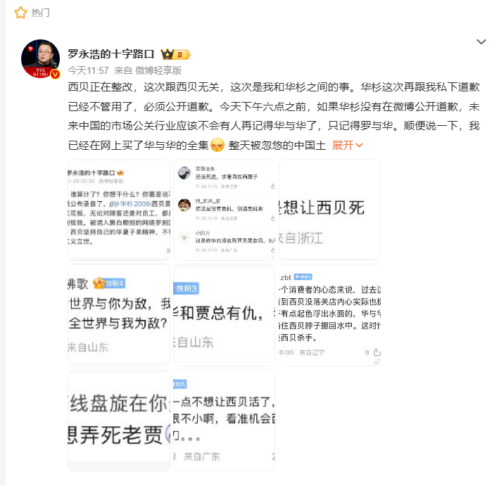 11月26日上午11时许,罗永浩再次发文称:“西贝正在整改,这次跟西贝无关,这次是我和华杉之间的事。华杉这次再跟我私下道歉已经不管用了,必须公开道歉。今天下午六点之前,如果华杉没有在微博公开道歉,未来中国的市场公关行业应该不会有人再记得华与华了,只记得罗与华。顺便说一下,我已经在网上买了华与华的全集,整天被忽悠的中国土老板们,其实赚钱很不容易,也该有人给他们上一点营销防诈课了。”
