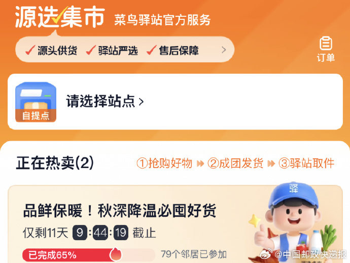 菜鸟近期布局社区团购新业务“源选集市”,采取源头供货、成团发货、驿站自提的模式,目标用户是菜鸟驿站周围的邻里居民。从测试界面看,该业务目前正在武汉低调试点,还处于早期阶段,尚未正式推出。小程序页面显示,“源选集市”是菜鸟驿站官方推出的团购服务,由驿站站长担任团长,驿站作为自提点。商品采用源头供货的方式,减少中间批发环节,降低商品成本。